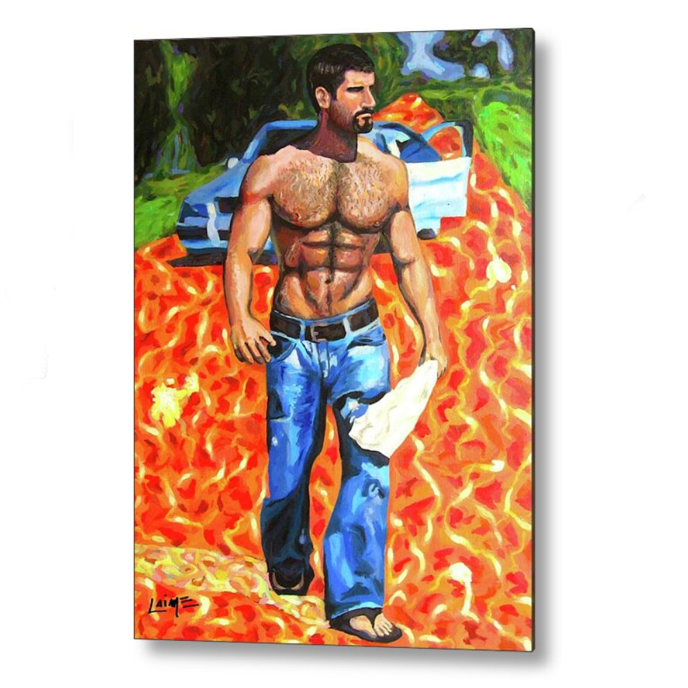 “Walking under the Sun” presents a hyper-charged, sun-drenched scene where a lone figure strides forward with striking confidence. The painting’s palette is dominated by incandescent oranges and yellows that evoke extreme heat, almost as if the ground itself were glowing. Against this fiery backdrop, the man’s bare torso becomes a focal point, rendered with bold, expressive brushstrokes that emphasise musculature and physical presence.