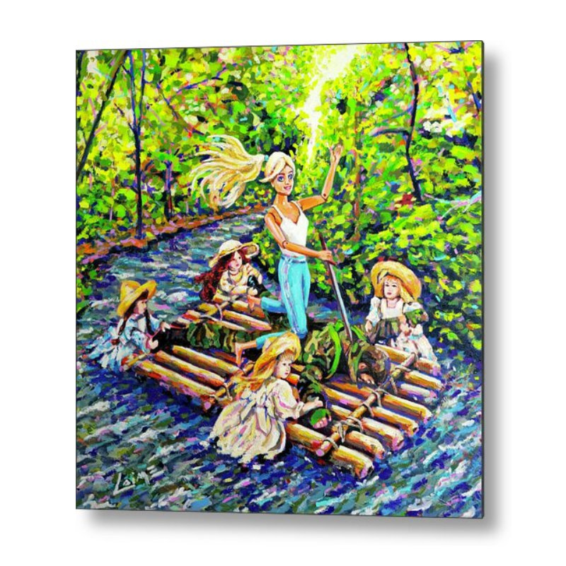 This vibrant oil painting presents a striking scene set on a Flößer — the traditional wooden raft once used in the Black Forest to transport timber along mountain rivers. Rendered in lively, broken brushstrokes and a luminous palette of greens, blues, and yellows, the composition places a doll-like blonde woman at its centre. She stands tall on the raft, bathed in a shaft of golden light formed by an intentional opening in the tree canopy above, a visual device that frames her as a chosen or empowered figure. Around her, four Victorian-style dolls cluster in soft pastels, their poses both delicate and watchful.